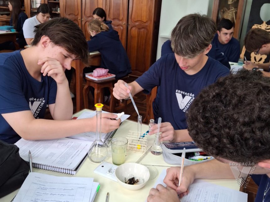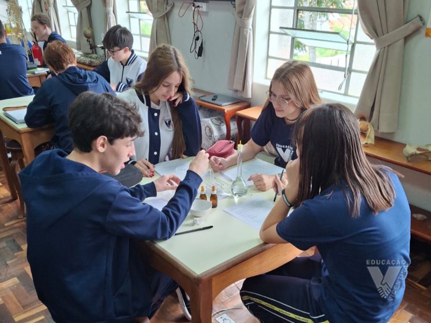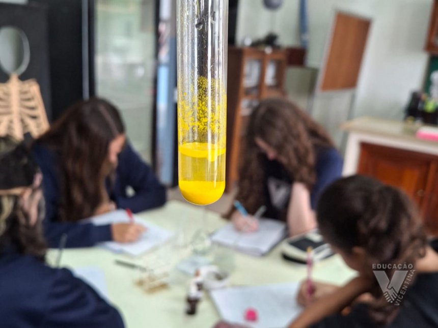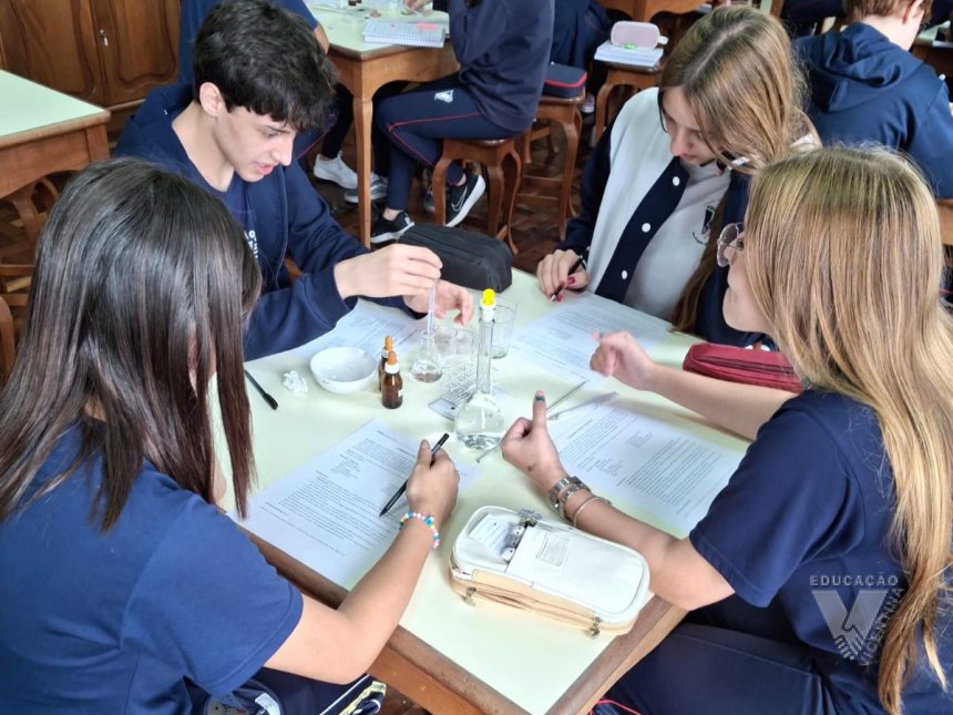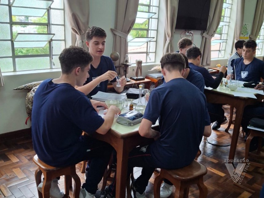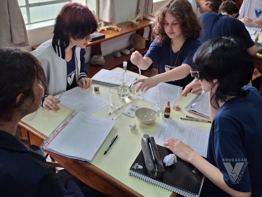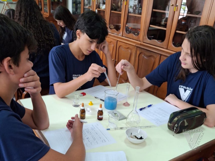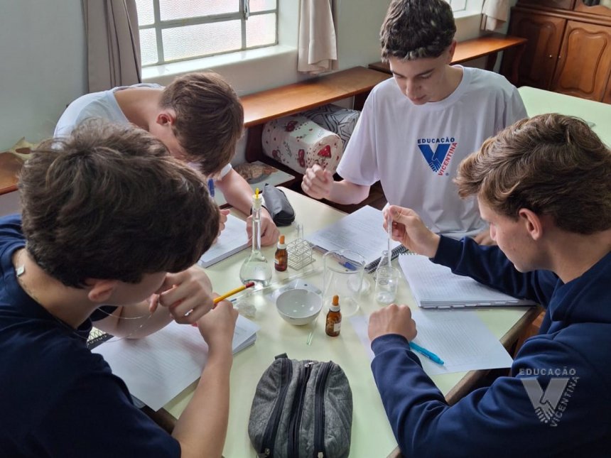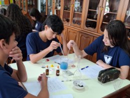 Sob orientação da professora de Química, Daniele, os alunos caminharam pela escola observando e anotando diversos fenômenos observados em grupos e, posteriormente, no laboratório, classificaram e testaram experimentos onde puderam perceber precipitações, mudanças de cor, liberação de gases, mudanças de estado físico, entre outras alterações na matéria, comprovando na prática os objetos de conhecimento estudados ao longo do 9º ano do Ensino Fundamental e em suas primeiras semanas de aula no Ensino Médio.