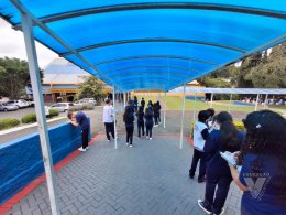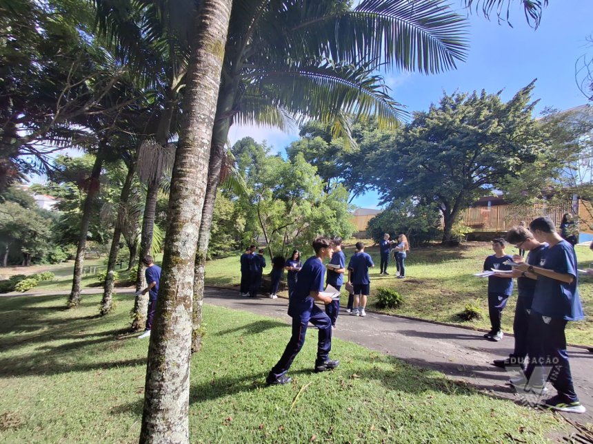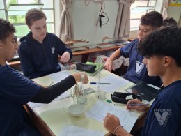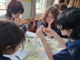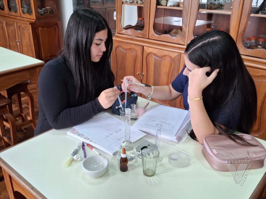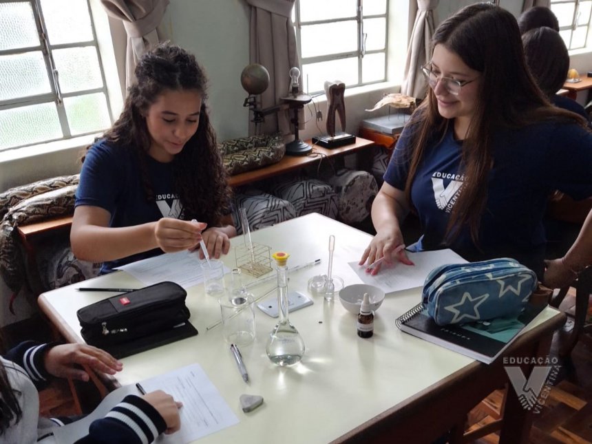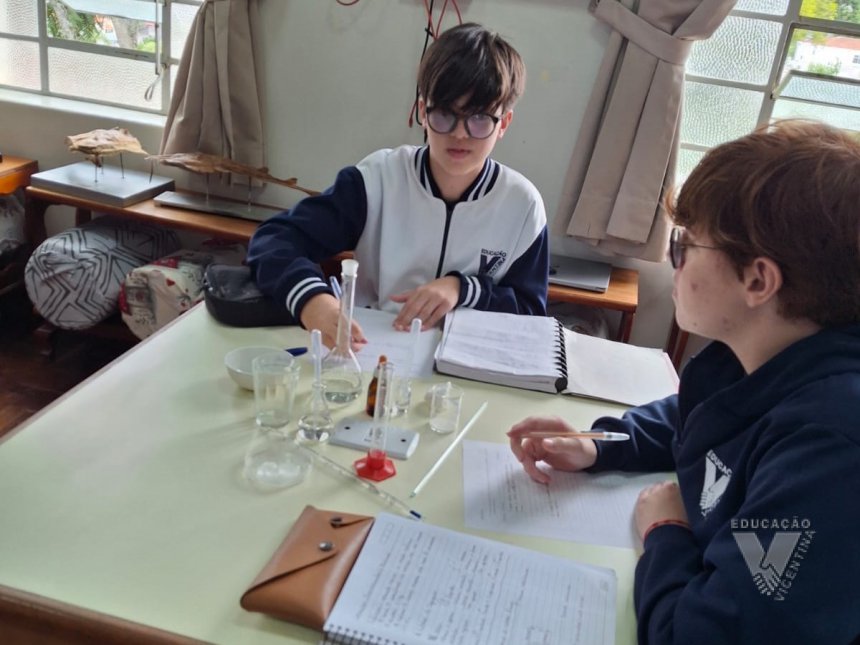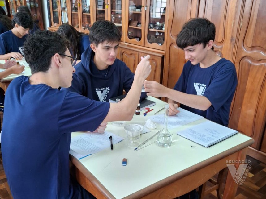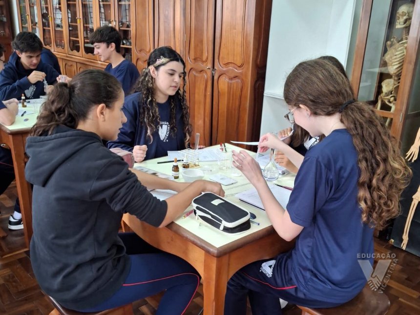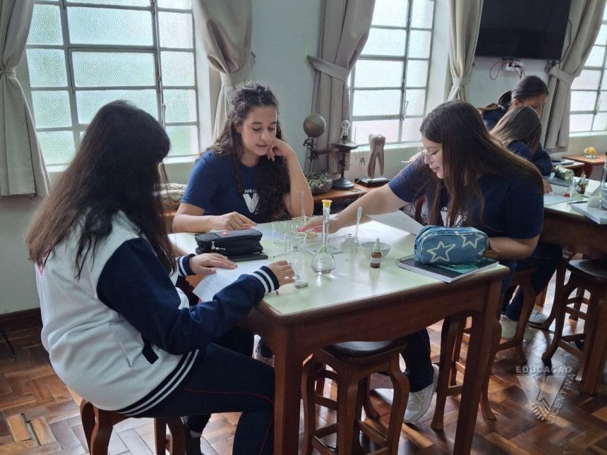Sob orientação da professora de Química, Daniele, os alunos caminharam pela escola observando e anotando diversos fenômenos observados em grupos e, posteriormente, no laboratório, classificaram e testaram experimentos onde puderam perceber precipitações, mudanças de cor, liberação de gases, mudanças de estado físico, entre outras alterações na matéria, comprovando na prática os objetos de conhecimento estudados ao longo do 9º ano do Ensino Fundamental e em suas primeiras semanas de aula no Ensino Médio.