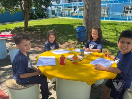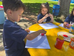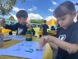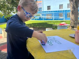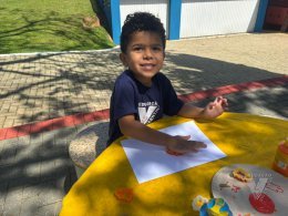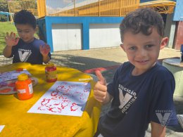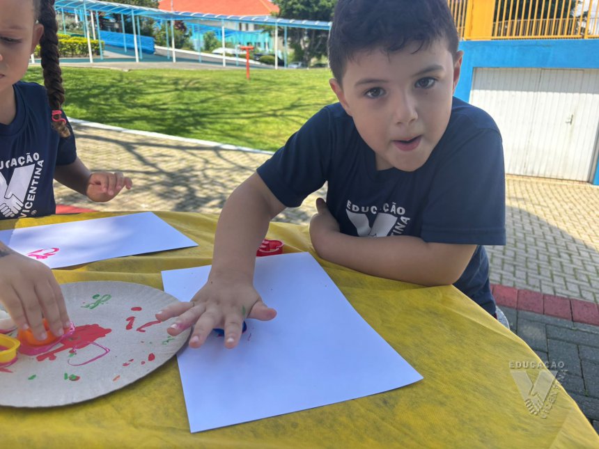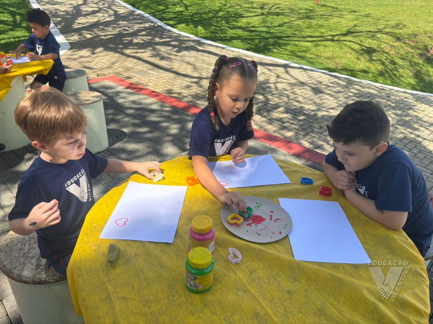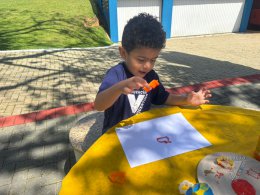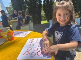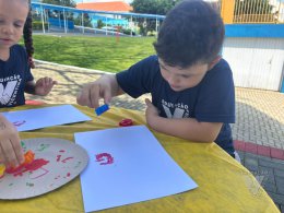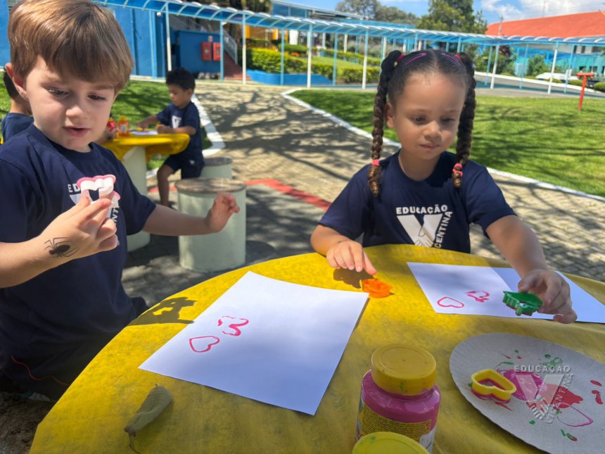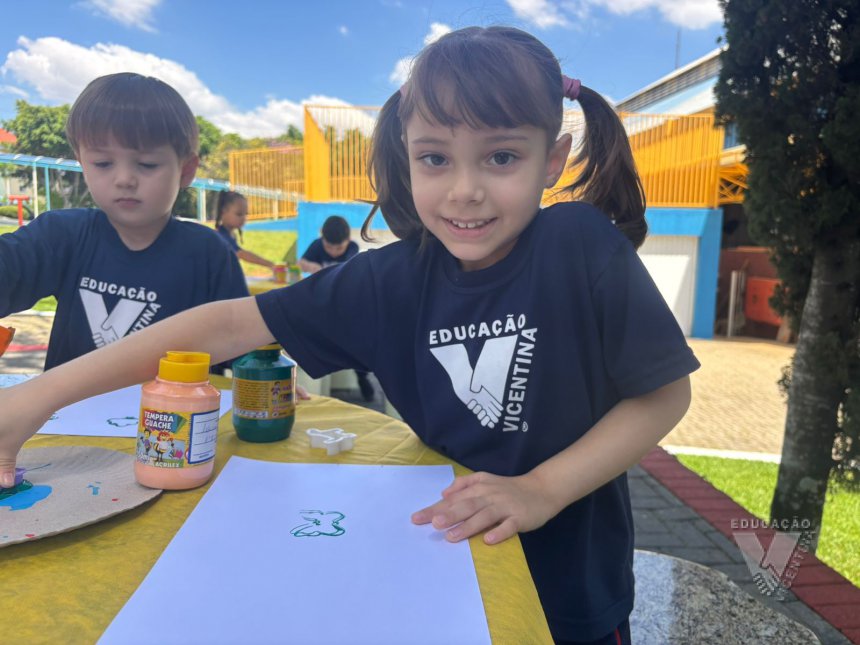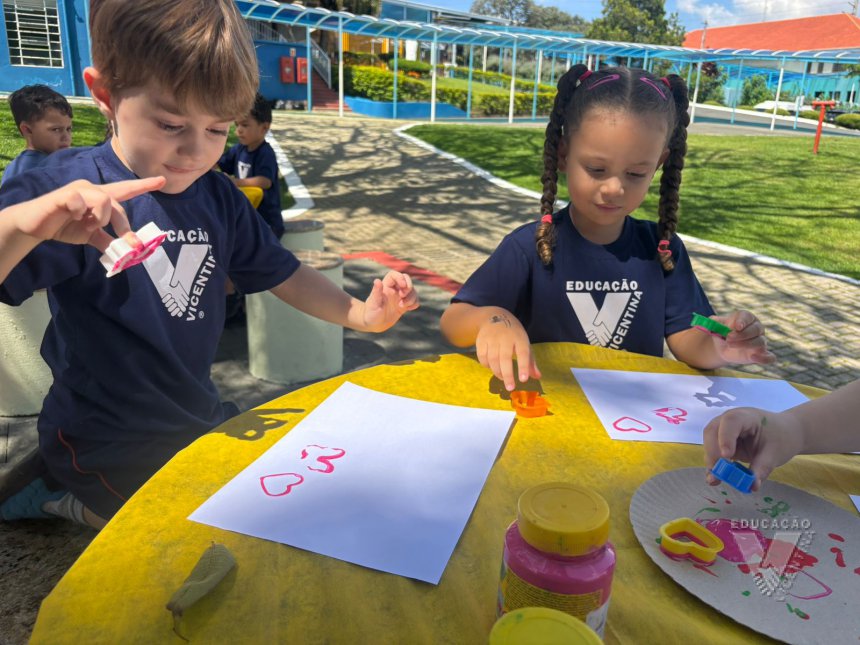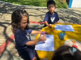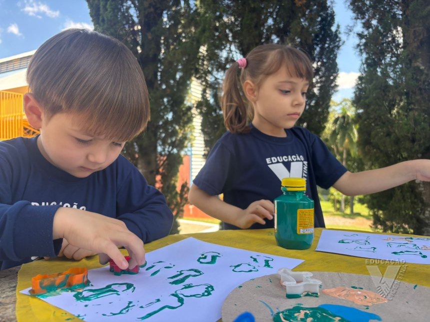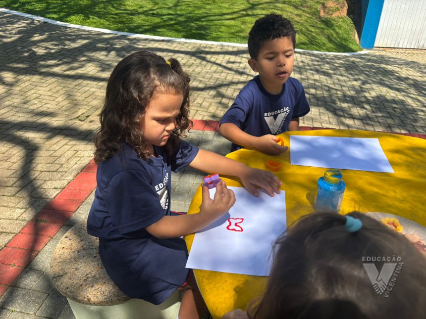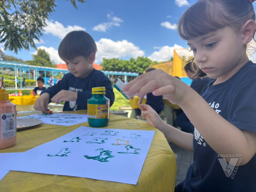 Os estudantes do Nível 4C exploraram uma atividade de carimbo usando forminhas de massinha, descobrindo diferentes formas e recriando seus desenhos no papel.