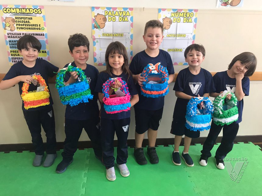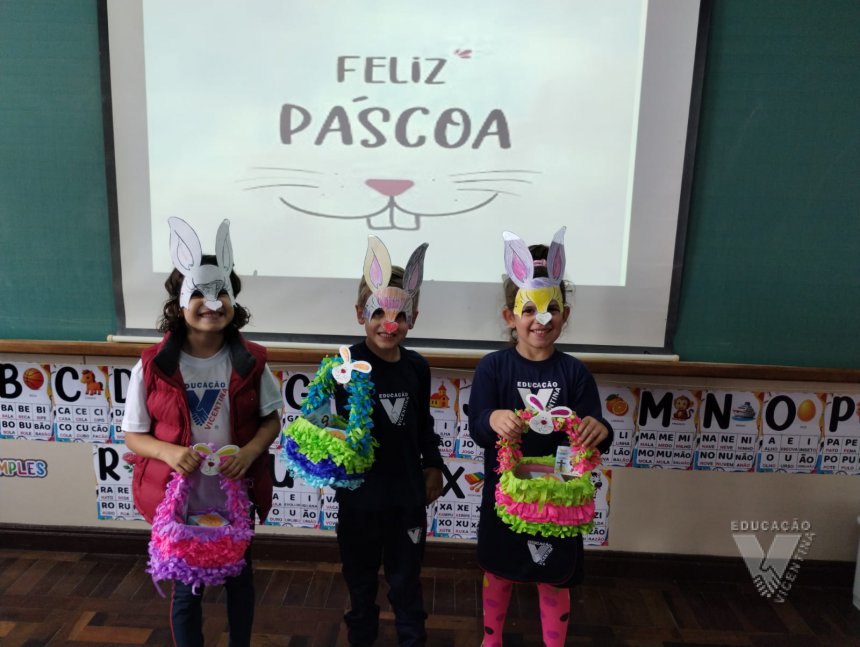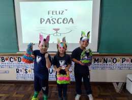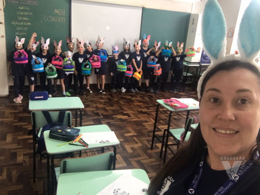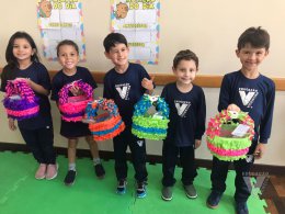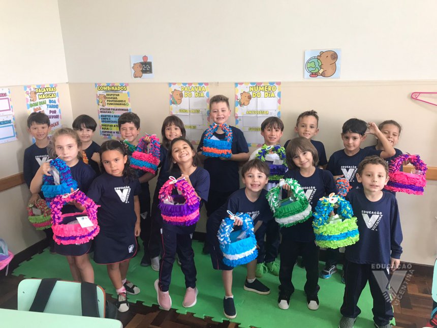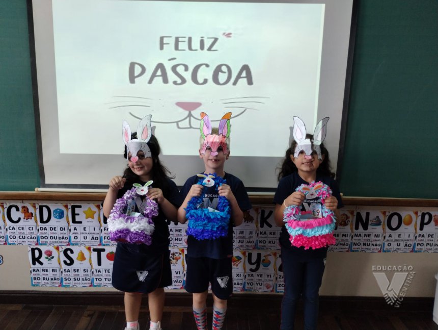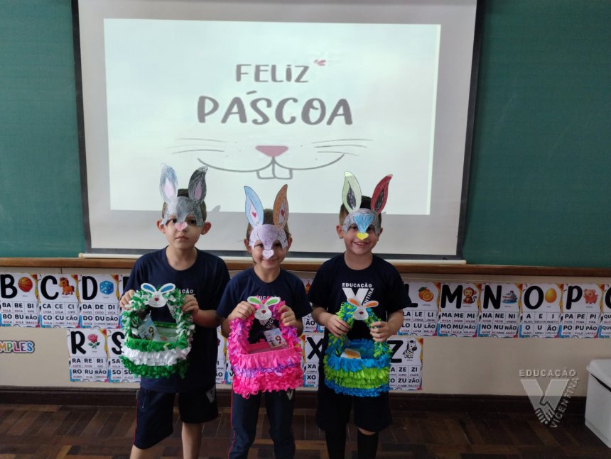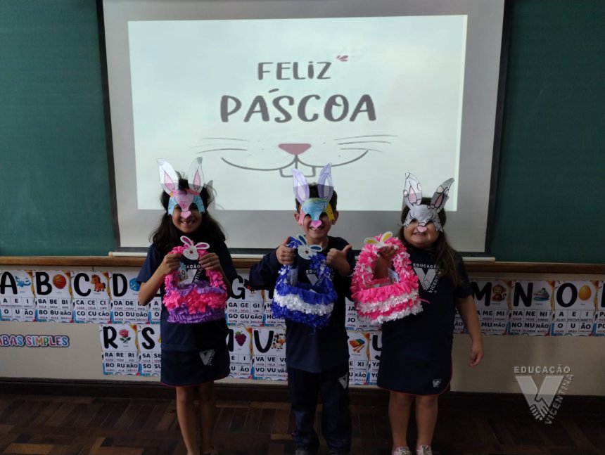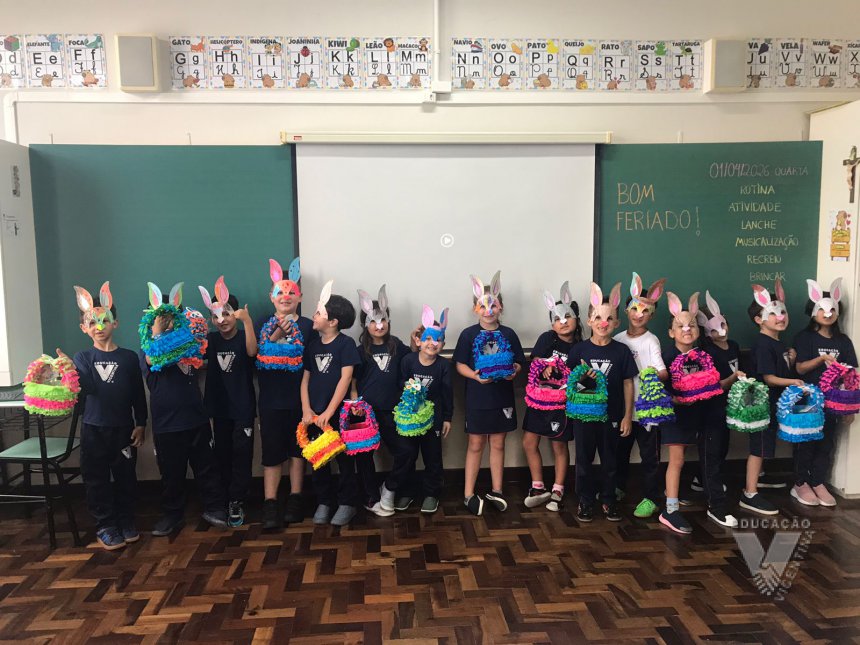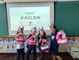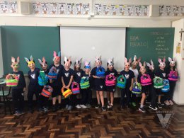 Para celebrar a Páscoa, os estudantes do 1º ano B e C confeccionaram máscaras do coelhinho da Páscoa e receberam das professoras, uma linda cesta para comemorar esta data tão importante com a família.