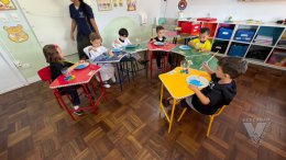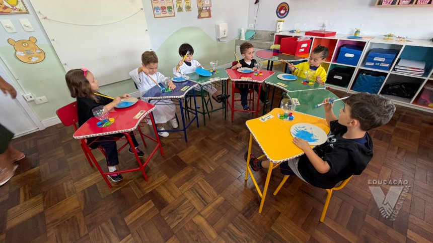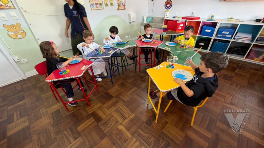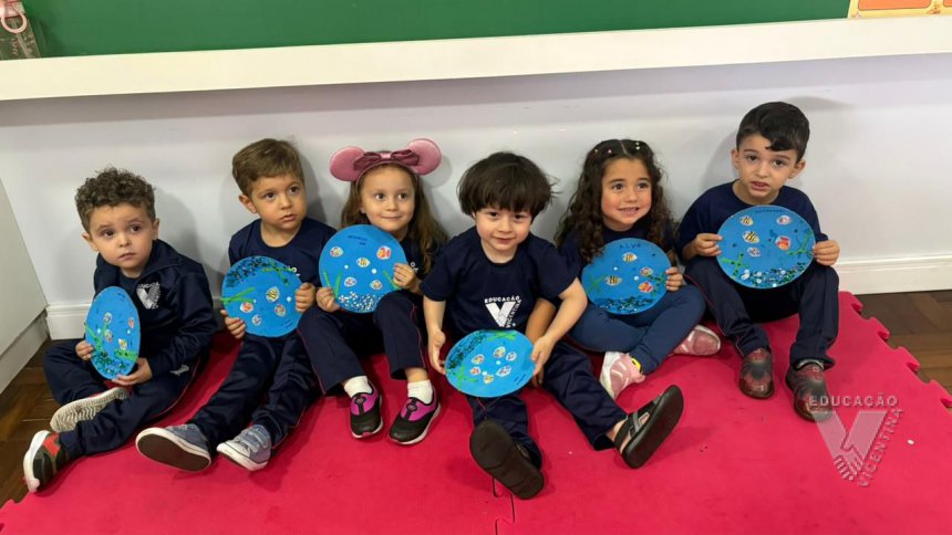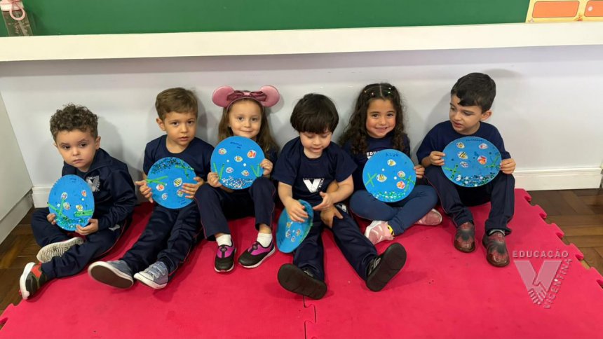 Pensando nisso, os estudantes do Nível 3C criaram seu próprio fundo do mar, utilizando tinta e materiais alternativos.