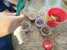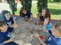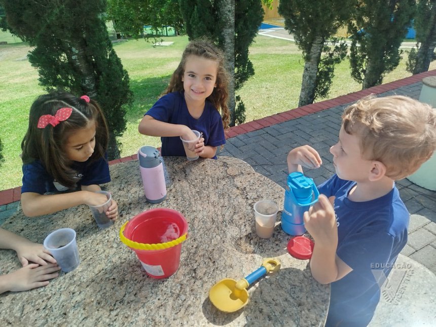 Em contato com a natureza, exploraram a terra e a areia em diferentes estados (seca e molhada) percebendo suas texturas, sensações e diferenças.
