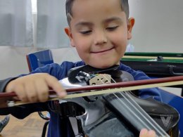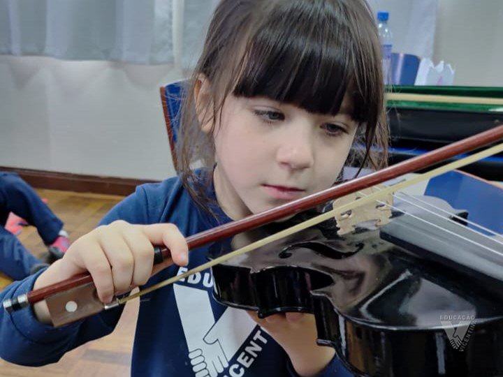 Para representar os instrumentos de corda, os estudantes do Nível 5C tiveram a oportunidade de, durante a aula de musicalização, ver de pertinho e tocar um violino!