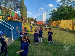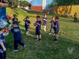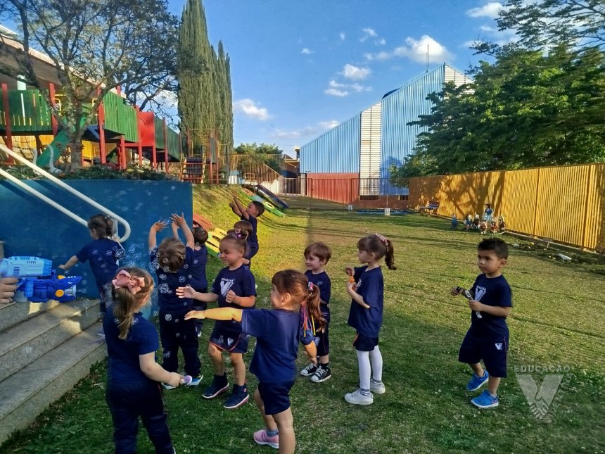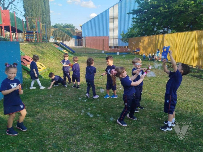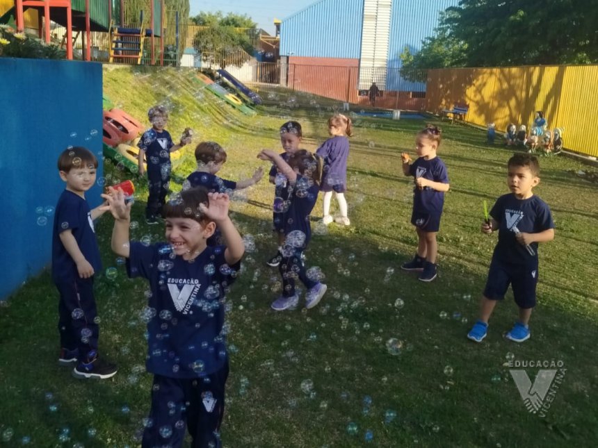 Com o auxílio das professoras, os estudantes puderam observar e brincar com as bolhas de sabão na área externa do Colégio.