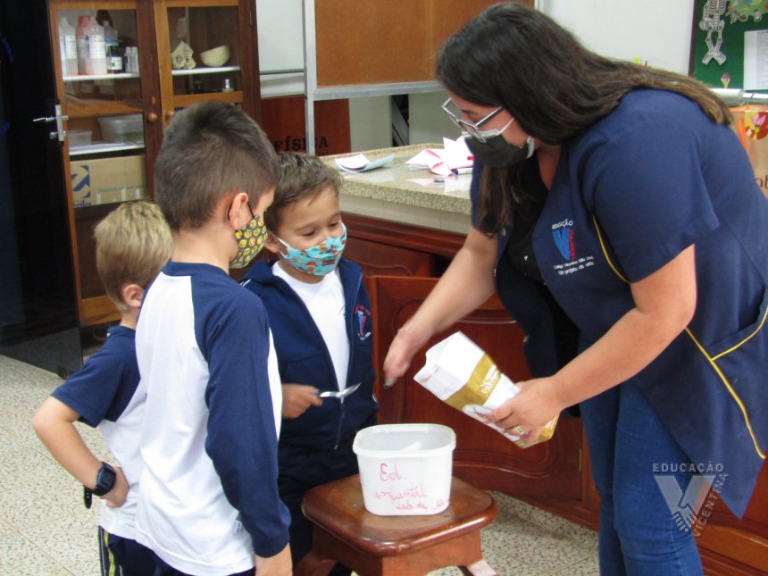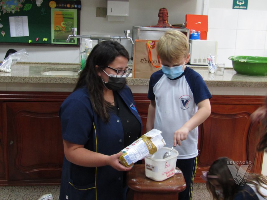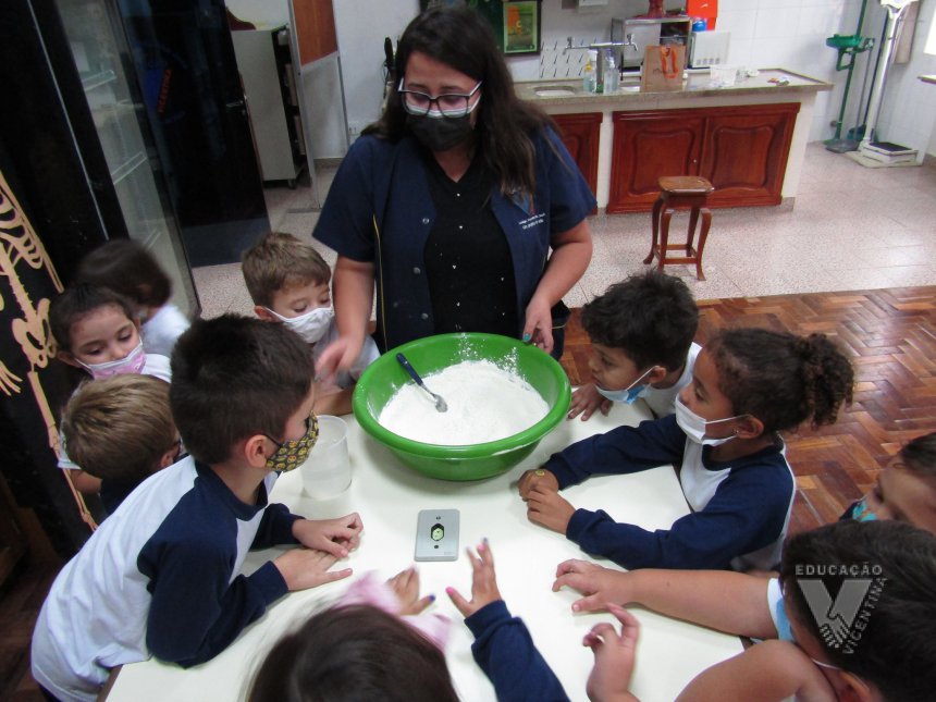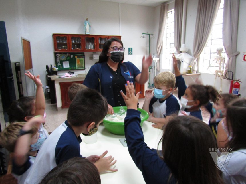 Sob a orientação da professora Bruna, cada estudante preparou uma parte da receita e, em seguida, se divertiram com as massinhas em sala de aula!