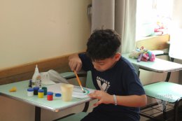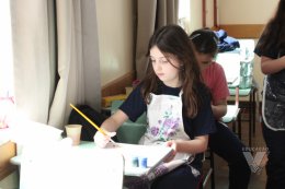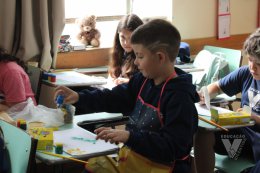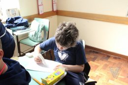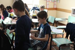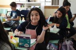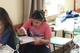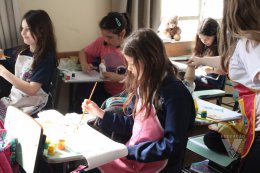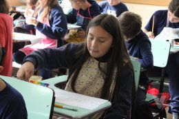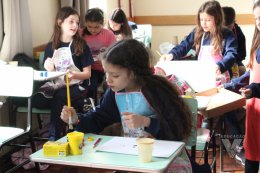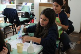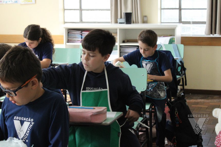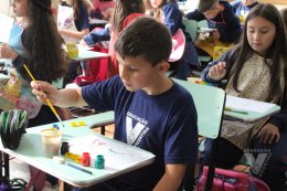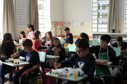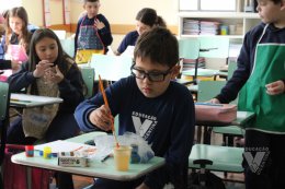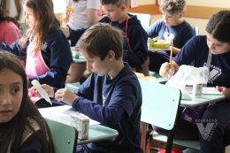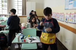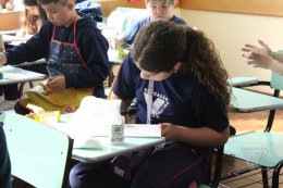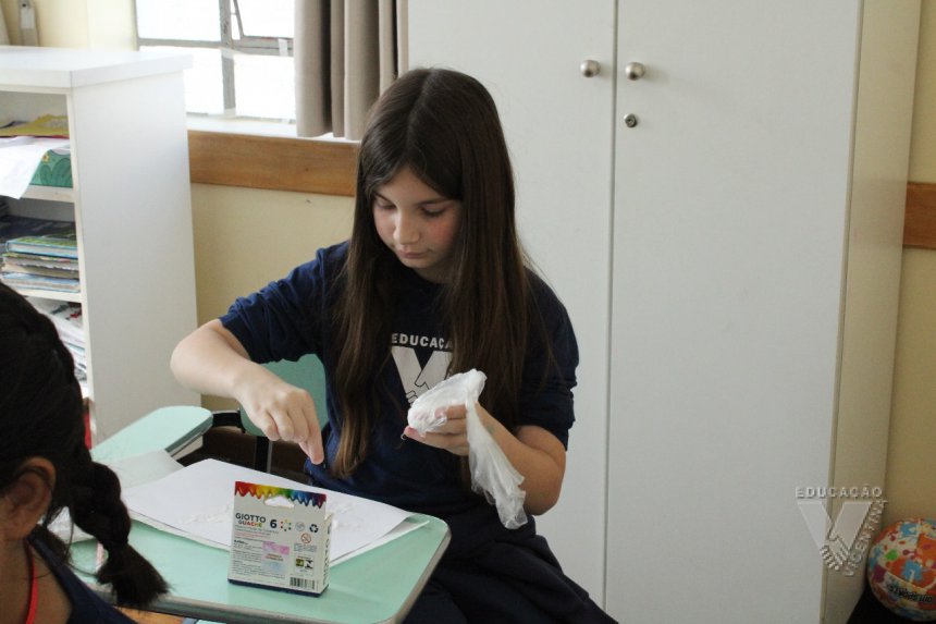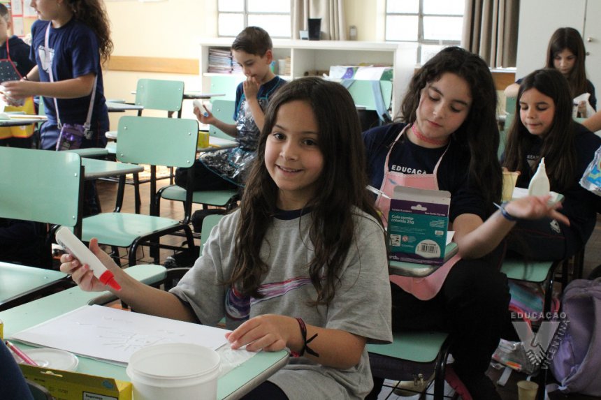 Os estudantes do 3º ano B desenharam com cola em uma folha de papel, cobriram o desenho com sal e, após a secagem da cola, aplicaram sobre as linhas de sal, observando a cor se espalhar magicamente.
