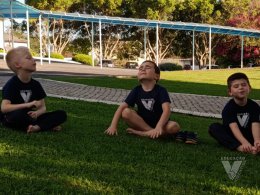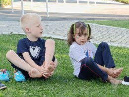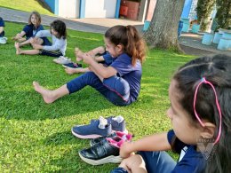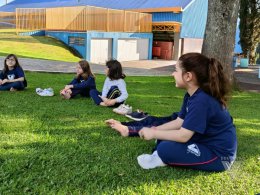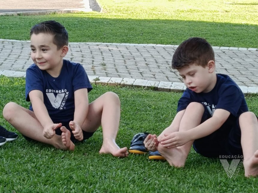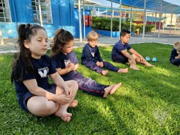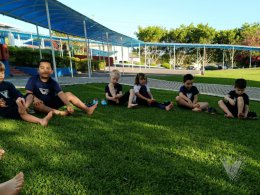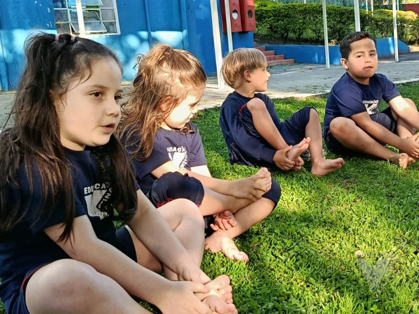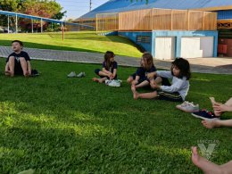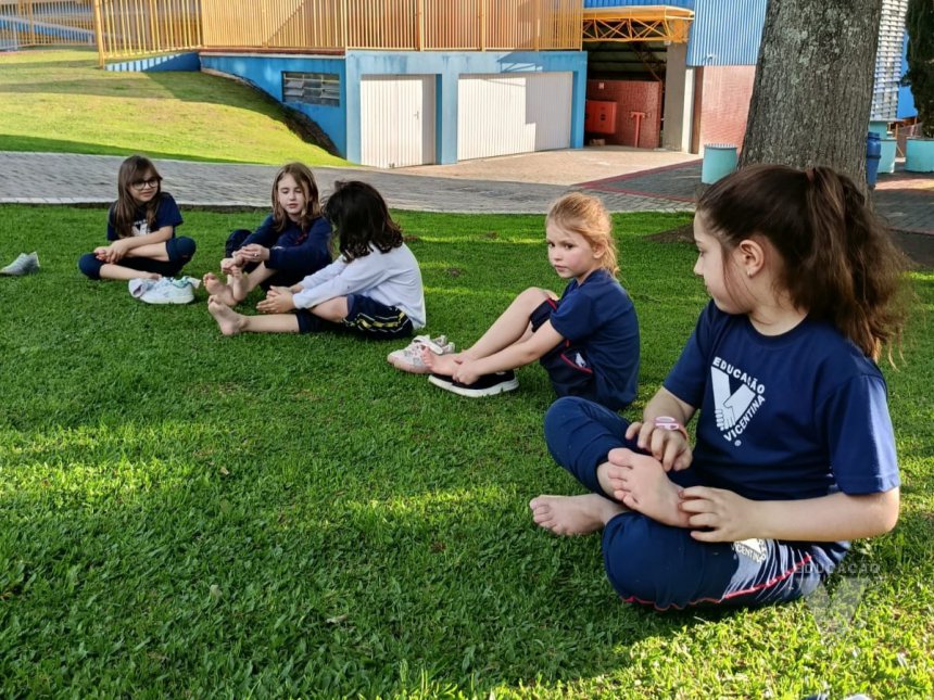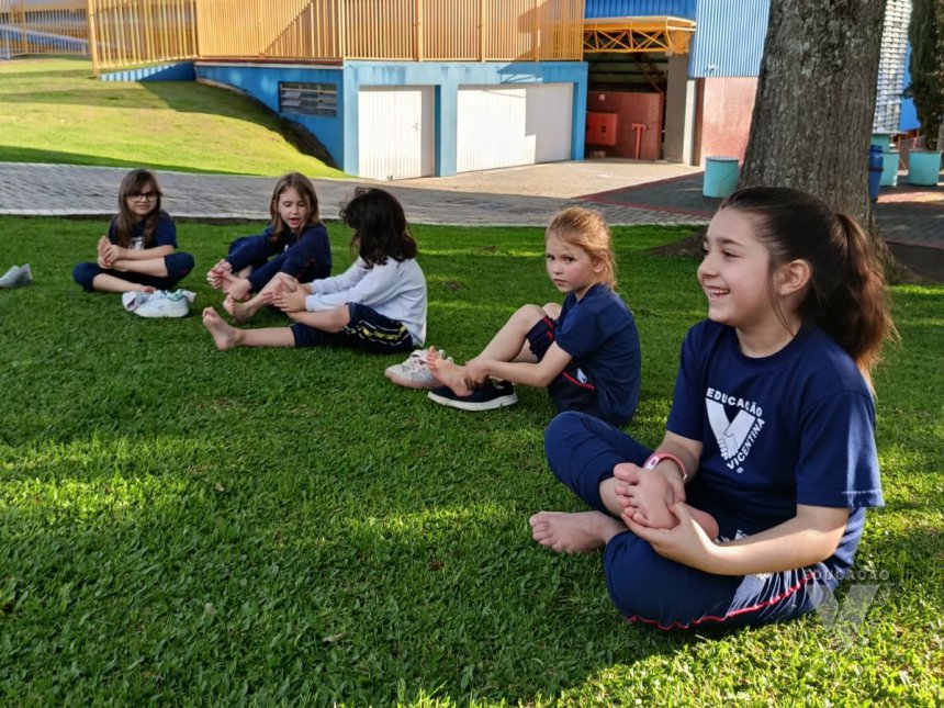 Pensando nisso, os estudantes do Nível 5C utilizaram o espaço da nossa área verde e fizeram um momento de relaxamento e movimento corporal.