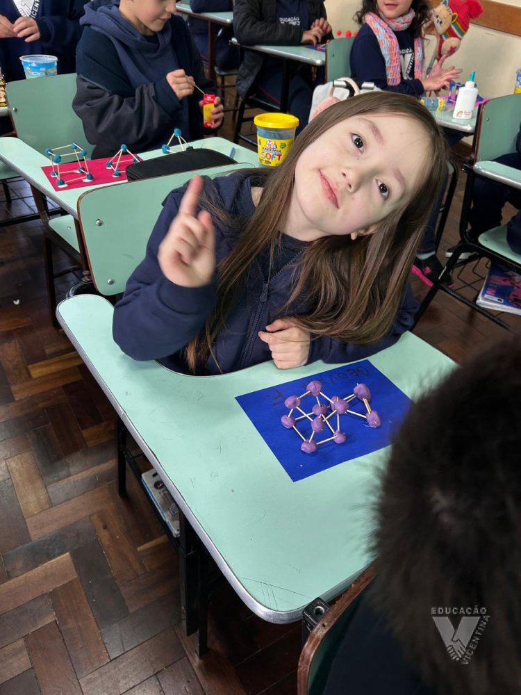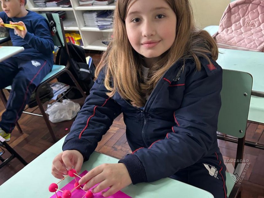 Com o objetivo de reforçar o conteúdo aprendido, os estudantes do 3º ano B montaram diversos sólidos geométricos, utilizando massinha de modelar para as vértices e palitos de picolé para as arestas.