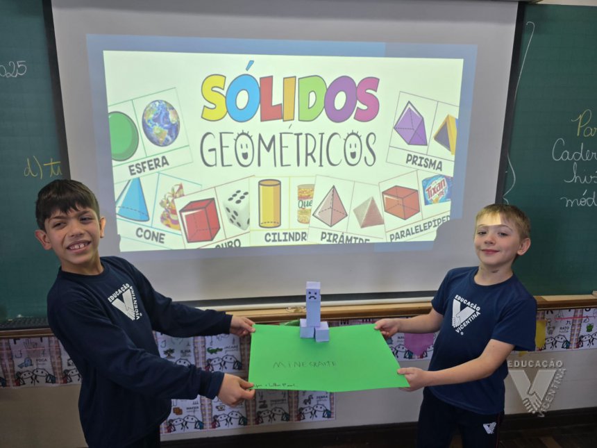 Depois de aprenderem em sala sobre as características dessas formas — como vértices, faces e arestas —, eles colocaram a criatividade em ação e montaram diferentes objetos utilizando sólidos como cubos, prismas e pirâmides.