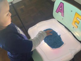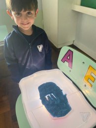 Ao observar o formato das letras, cada um escreveu a vogal correspondente utilizando apenas o seu dedo e areia!